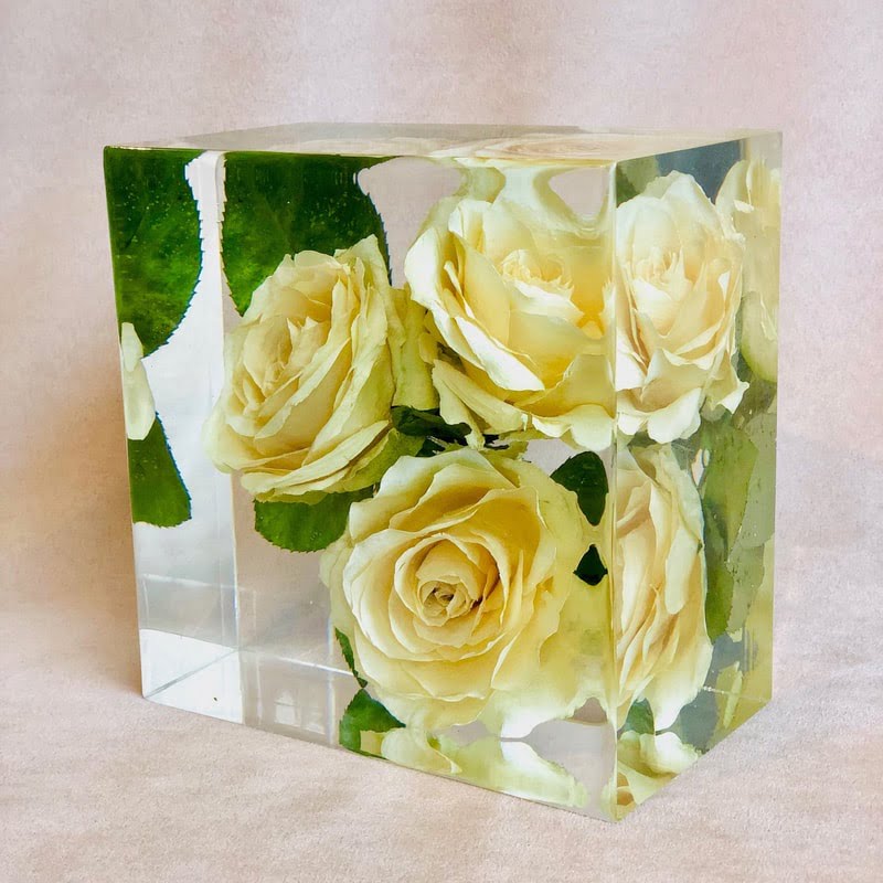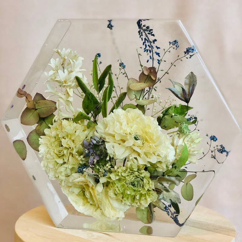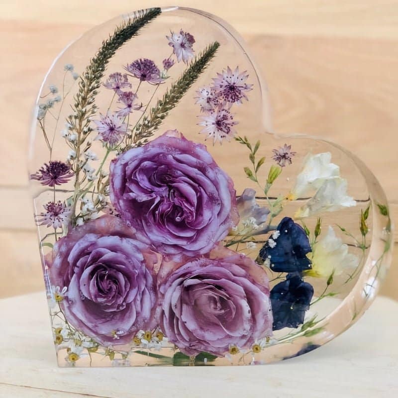 Zo blijft de bloem jaren mooi. Een massieve harsgieting is een duurzame, doch smaakvolle omlijsting van dierbare bloemen.